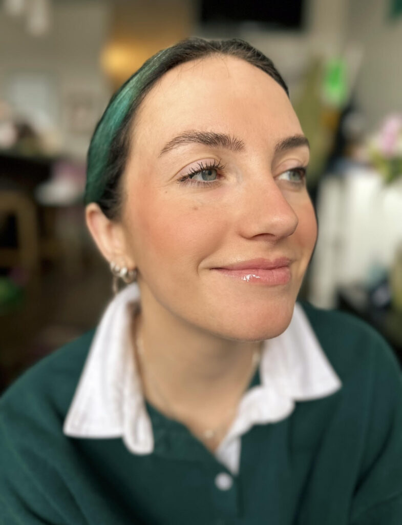 To recreate this look, brush your brows upwards with a clean spoolie to get them in the shape you’re wanting. Then, add your clear or tinted gel and brush fully upward across the brow. You can run the applicator or a clean cotton swab along the top of the brow to give more shape and definition, but brushed up and feathered out is also an option!